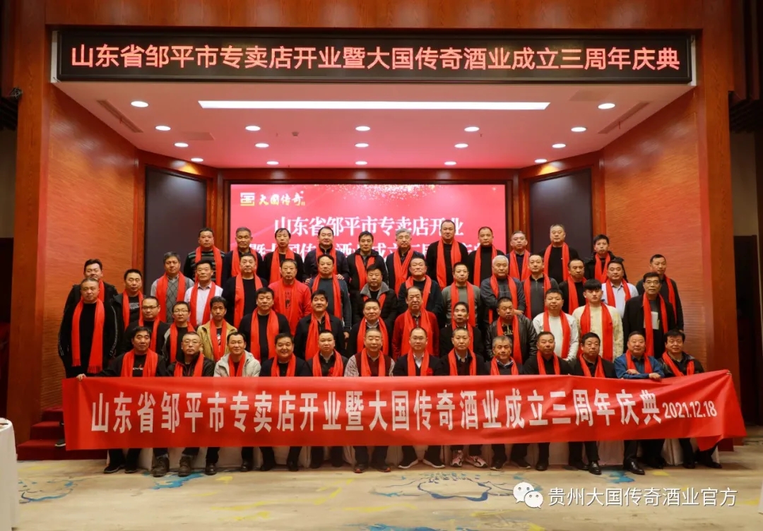 2021年12月12日,新年的鐘聲即將敲響,伴隨著冬日溫暖的陽光,貴州大國傳奇山東(鄒平)專賣店開業(yè)暨大國傳奇酒業(yè)三周年慶典儀式在隆隆的禮炮聲中拉開大幕。